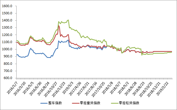 图1 2016-2018年各周中国公路物流运价指数 分车型看,各车型指数均小幅回升。其中,整车指数为971.70点,环比回升0.17%;零担重货指数为971.44点,环比回升0.17%;零担轻货指数为957.90点,环比回升0.16%。 图2 2016年以来各周中国公路物流运价分车型指数 表1 本周部分线路平均价格及环比情况对比 线 路 单位 太原-厦门 天津-武汉 长春-济南 整车价格(9.6米) 元/车 6562 6269 3749 比上周(±) % 2.74 0.43 2.54 整车价格(13.5米) 元/车 9115 8707 5207 比上周(±) % 2.75 0.43 2.52 整车价格(17.5米) 元/车 10938 10449 6248 比上周(±) % 2.75 0.43 2.51 零担轻货价格 元/立方 90 87 51 比上周(±) % 2.27 0.01 2.0 零担重货价格 元/吨 364 347 208 比上周(±) % 2.83 0.29 2.46.png)