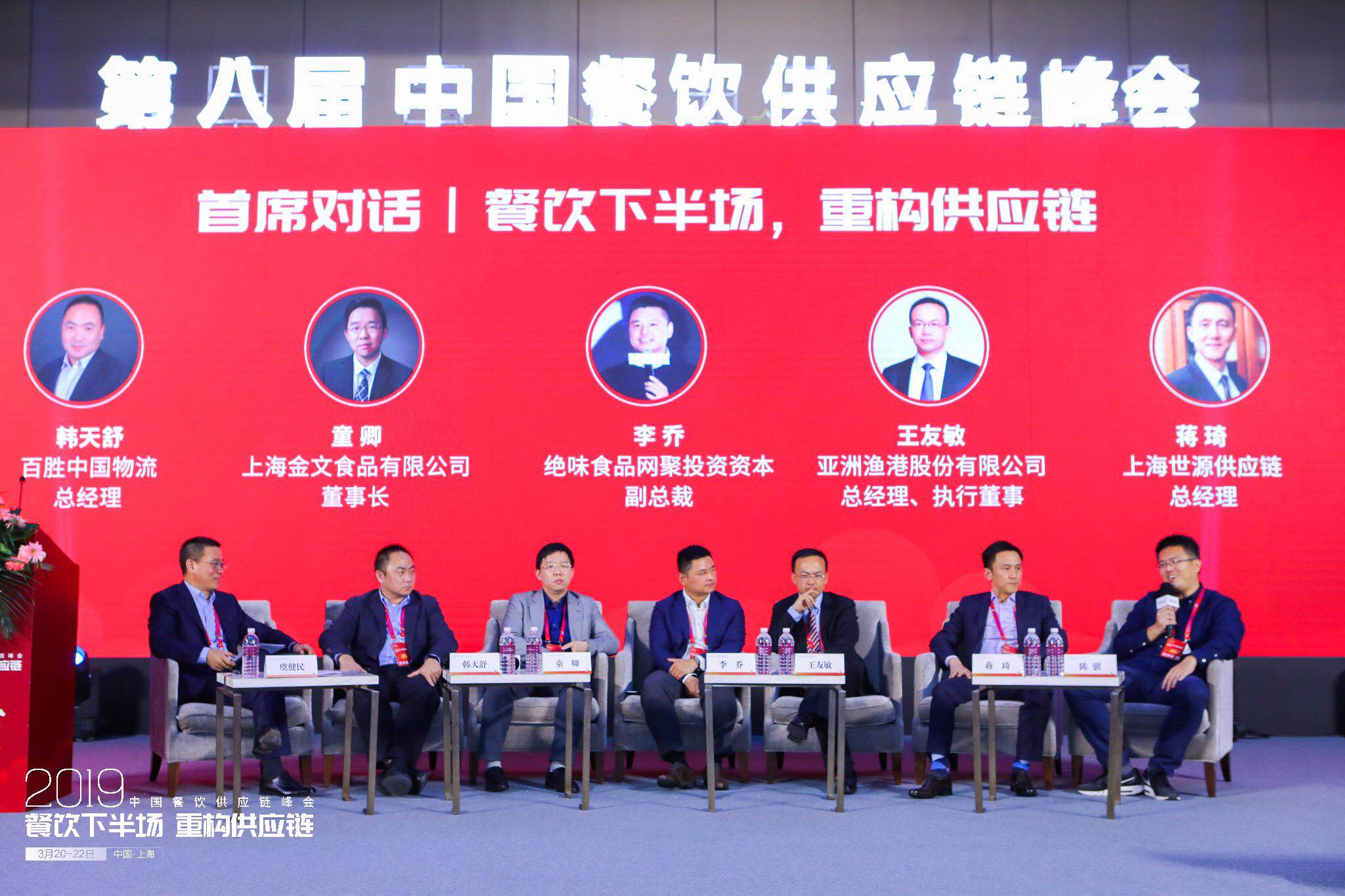 之后开展了“餐饮下半场,重构供应链”的首席对话活动,普洛斯顾问虞健民主持嘉宾,百胜中国物流总经理韩天舒,上海金文食品有限公司董事长童卿,绝味食品网聚投资资本副总裁李乔,亚洲渔港股份有限公司总经理、执行董事王友敏,上海世源供应链管理有限公司总经理蒋琦,饿了么新零售新餐饮供应链平台负责人陈骐作为互动嘉宾共同探讨,餐饮今后的变化及趋势。