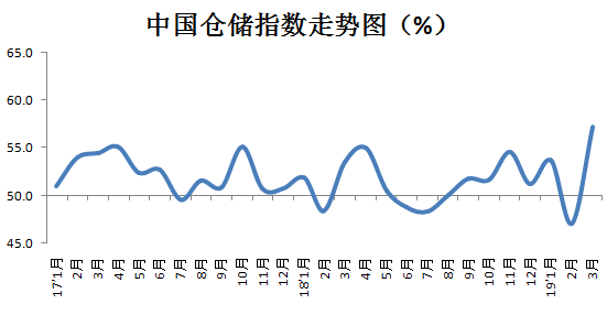 发布的2019年3月份中国物流业景气指数为52.6%,较上月回升3个百分点;中国仓储指数为57.2%,较上月回升10.1个百分点。