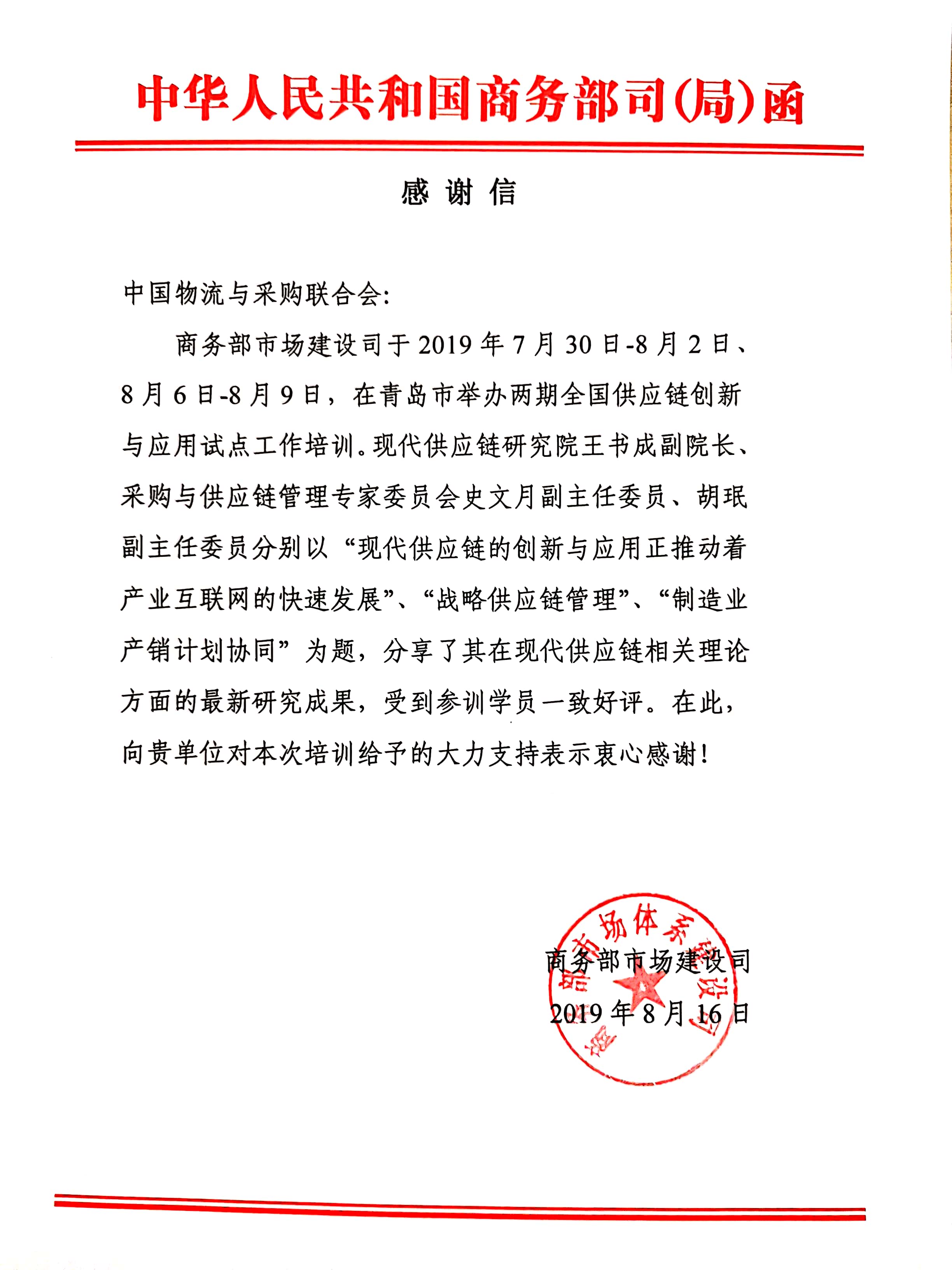近日,雷竞技电竞竞猜网 (以下简称中物联)收到商务部市场建设司致函,对于中物联委派3位专家在“全国供应链创新与应用试点工作培训”中的授课与分享表示感谢。