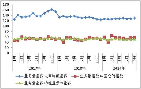 图 3 物流业景气指数、中国仓储指数、电商物流指数业务量指数走势