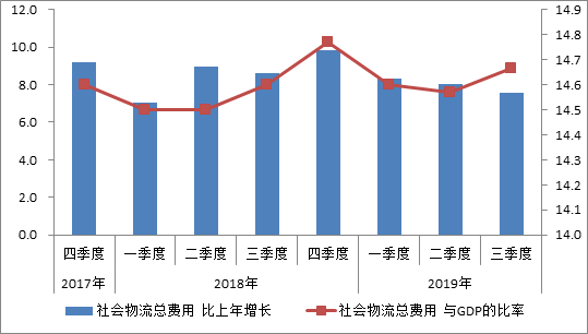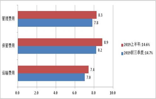 前三季度,社会物流总费用与GDP的比率为14.7%,尽管比2018年全年回落0.1个百分点,但比上年同期、今年上半年均提高0.1个百分点。2017年之前,这一比率连续5年下降,2018-2019年出现反复,这不改变在产业、经济、政策等综合作用下物流效率改善的基本趋势,但从近期情况看,物流成本水平的上升与物流运行的微观环境恶化及经济运行过程中保管环节成本提高有较大关系。
