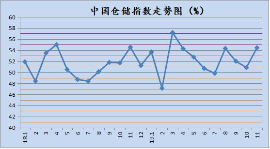周转效率明显提高。11月份,平均库存周转次数指数为54.8%,较上月回升4.8个百分点,达到七个月来的高点,反映出在需求回升、仓储业务活动活跃的背景下,商品周转效率明显提高。分品种来看,钢材、有色、化工类生产资料类商品及服装类等生活资料类商品周转效率较上月回升幅度较大。