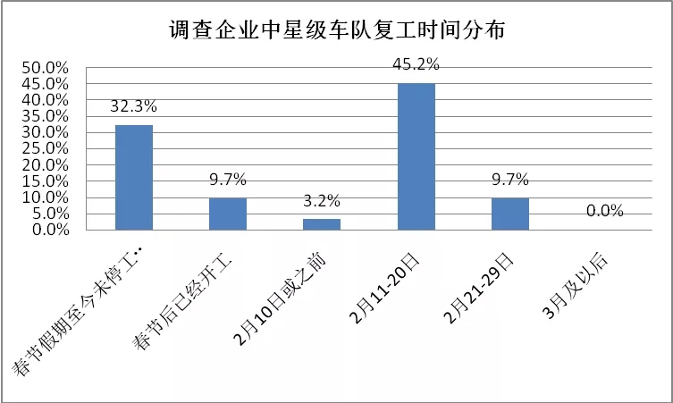 被调查企业中,85%的企业反映疫情对企业经营造成较大影响,其中反映影响较大的占50%,部分企业经营暂时停顿。还有7%的企业反映影响严重,可能出现破产倒闭风险。被调查企业中,2月10日后开工的占58%,但是据调研企业反映,企业复工复产形势严峻,多地存在延期复工问题。星级车队复工情况好于行业平均水平,有32.3%的车队春节至今未停工停产。