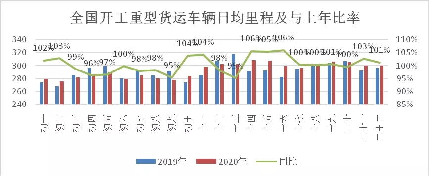 行业大数据显示,行业车辆开工率大幅低于往年。据全国道路货运车辆公共监管与服务平台数据分析显示,全国货运车辆节后开工形势不佳,正月十五(2月8日)全国12吨以上重型货运车辆开工率仅为往年同期的四分之一。正月十七(2月10)以后,随着企业加快复工复产,行业开工率小幅回升,接近往年的三成左右。开工车辆运行效率稳定,数据显示,节后全国开工重型货运车辆日均行驶里程与上年基本持平,反映已开工车辆运行效率基本稳定。