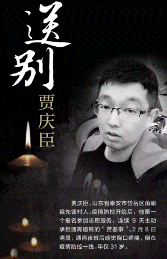 2月8日一早,刚刚值了一个通宵的贾庆臣感觉胸口疼得厉害,还没来得及去医院,他就倒在了战“疫”一线,生命永远定格在了31岁。