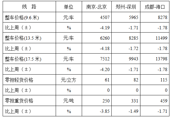 分车型看,各车型指数总体稳定,略微波动。其中,整车指数为989.74点,比上周回落0.01%;零担轻货指数为967.82点,与上周基本持平;零担重货指数为989.55点,比上周回落0.01%。