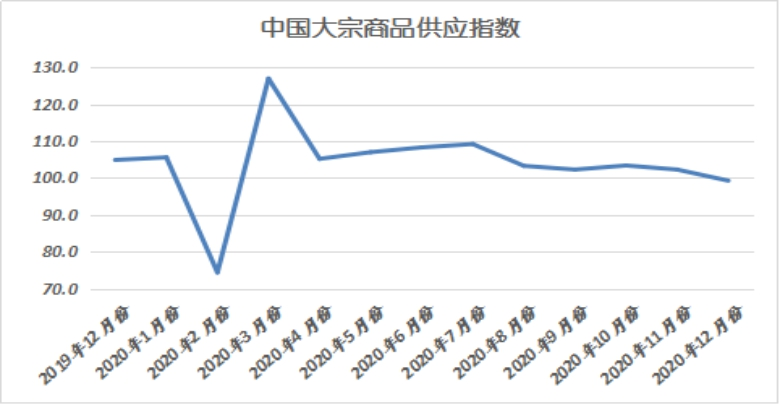 2020年12月份,大宗商品供应指数为99.3%,指数两连跌至近十个月以来的低点。数据显示,12月份以来,在生产企业利润收窄以及各地环保限产趋严的作用下,部分商品产量明显减少,市场供应开始下降。从各主要商品情况来看,钢铁、铁矿石、煤炭和成品油供应量继续减少,有色金属、化工和汽车供应量继续增加,且增速均有所扩大。