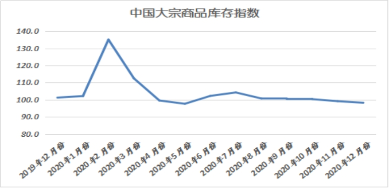 2020年12月份,大宗商品库存指数为98.3%,较上月下降0.9个百分点,显示随着供应量下降以及商品需求整体超预期,商品“去库存化”得到延续,商品库存压力持续缓解。各主要商品中,钢铁、铁矿石、原煤和成品油库存量继续下降,有色金属库存量开始减少,化工和汽车库存量则继续增加,但增速均有所减缓。