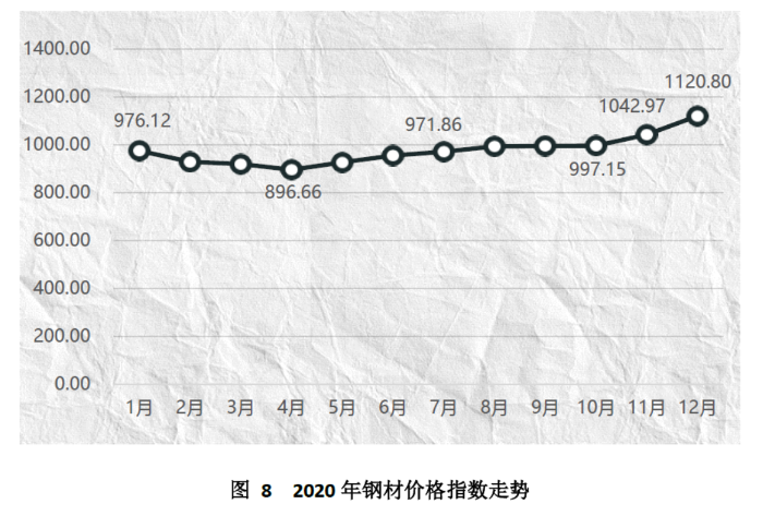 2020年,钢材价格先跌后涨。第一季度,在疫情的大范围影响下,钢材价格走跌,并于4月收报于全年最低点896.66点。随后,钢材价格稳步走高,尤其10月之后,钢材价格涨幅扩大,11月、12月环比涨幅分别达到4.60%和7.46%。整体来看,钢材价格平稳躲过了黑天鹅新冠疫情的影响,并呈现“旺季不旺,淡季不淡”的特点。