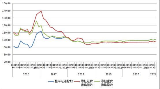 分车型指数看,各车型指数环比均有所回升,同比继续小幅增长。以大宗商品及区域运输为主的整车指数为100.8点,比上月回升1.11%,比上年同期回升2%。零担指数中,零担轻货指数为98.1点,比上月回升1.06%,比上年同期回升1.4%;零担重货指数为100.6点,比上月回升1.05%,比上年同期回升1.9%。