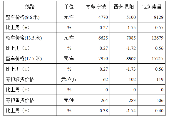 分车型看,各车型指数环比涨跌互现。其中,整车指数为1004.35点,比上周回落0.02%;零担轻货指数为981.20点,与上周持平;零担重货指数为1003.99点,比上周回落0.01%。