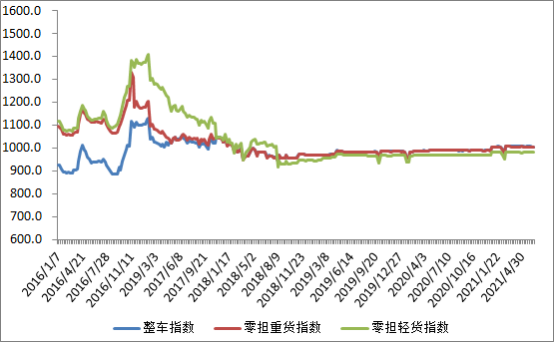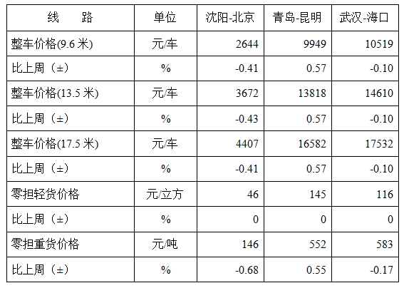 分车型看,各车型指数环比回升。其中,整车指数为1005.25点,比上周回落0.02%;零担轻货指数为981.21点,比上周回落0.01%;零担重货指数为1005.09点,比上周回落0.01%。