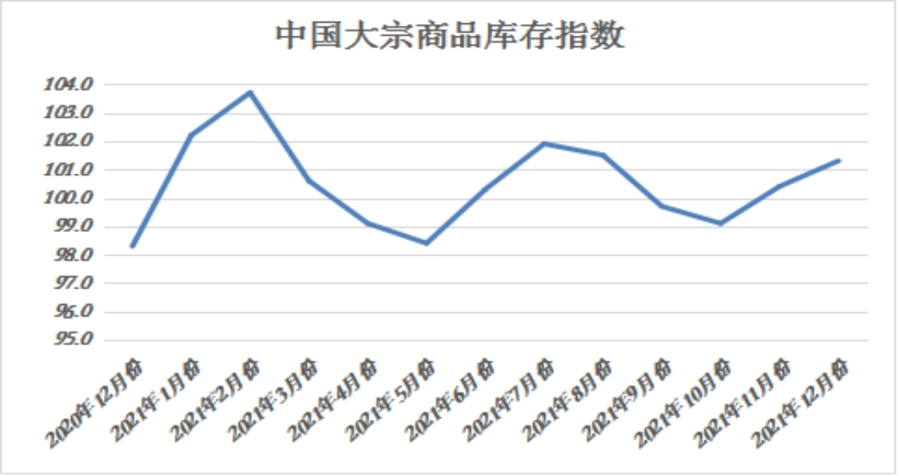 2021年12月份,大宗商品库存指数继续上升,至101.3%,较上月上升0.9个百分点,为近四个月以来的最高点,显示随着商品供应量明显增加,终端需求难以快速、有效地消化供应增量,商品继续累库,库存压力进一步加大。各主要商品中,除钢铁库存仍在下降外,其余品种均呈现上升态势,且增速均有加快。