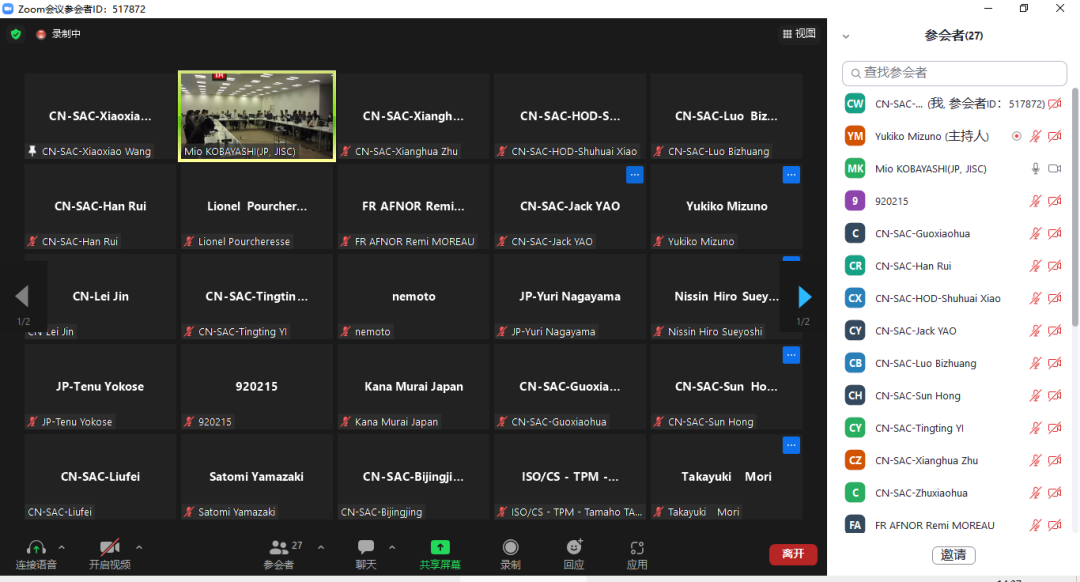 2022年11月29日至12月2日,ISO/TC 315 Cold chain logistics第三次全体工作会议及相关工作组会议通过线上以及东京线下的方式召开。来自中国、日本、韩国、德国、法国、英国、乌干达、新加坡、印度、印度尼西亚等10个国家的50余名代表出席了会议。