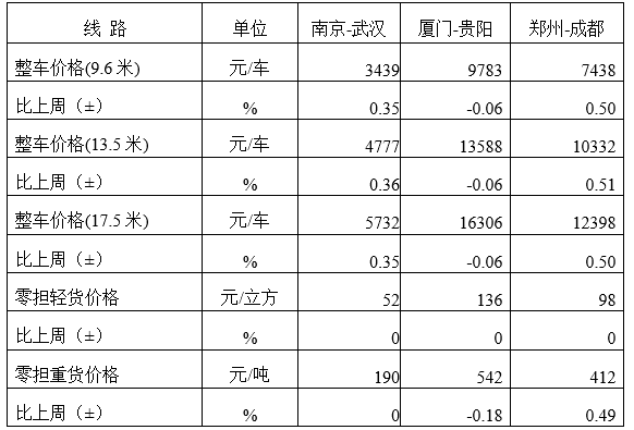 分车型看,各车型指数环比总体平稳。其中,整车指数为1027.40点,与上周基本持平;零担轻货指数为1041.29点,与上周基本持平;零担重货指数为1025.98点,比上周回落0.01%。