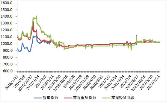 分车型看,各车型指数环比涨跌互现。其中,整车指数为1026.12点,比上周回落0.09%;零担轻货指数为1020.32点,比上周回升0.02%;零担重货指数为1025.11点,比上周回落0.1%。