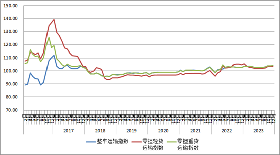 分车型指数看,各车型指数环比总体回升,同比去年涨跌互现。以大宗商品及区域运输为主的整车指数为104.2点,比上月回升0.24%,比上年同期回升1.45%。零担指数中,零担轻货指数为103.3点,与上月基本持平,比上年同期回落1.45%;零担重货指数为104.1点,比上月回升0. 28%,比上年同期回升1.52%。