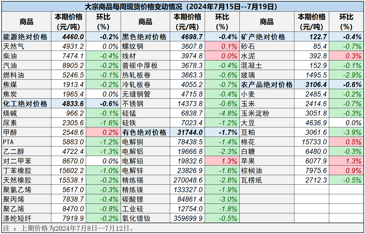 本表所示大宗商品价格(类别与产品规格说明见附表)为以人民币计价的现货价格(包含流通费用、利润和税费等)。计算这些价格时使用的信息来源,主要包括国内重点地区的生产商、贸易商及下游消费企业之间的成交、询报盘及可成交价格。价格单位为人民币元/吨。
