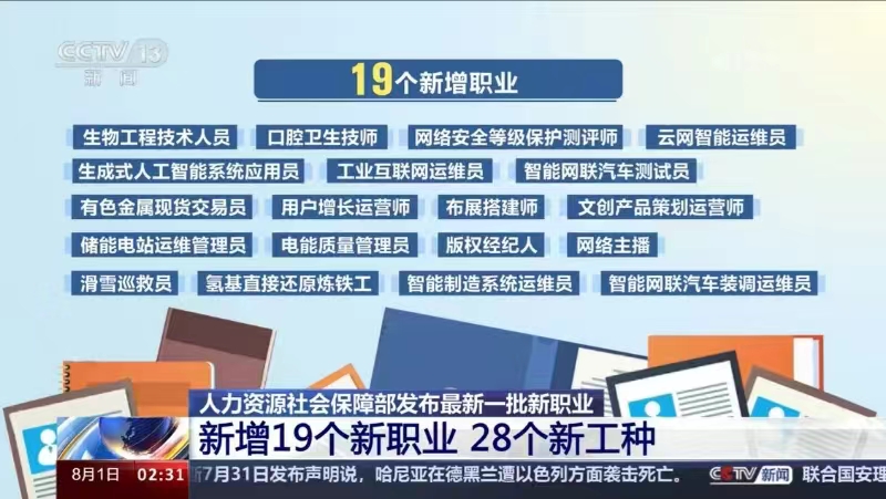 为健全符合我国国情的现代职业分类体系,大力发展新业态、新模式,开发新的就业增长点,2019年人力资源社会保障部建立完善新职业信息发布制度,实施职业分类动态调整,此后每年发布1至2批新职业信息。2022年,修订颁布《中华人民共和国职业分类大典(2022年版)》。为及时反映职业发展变化和趋势,2023年10月,人力资源社会保障部发布通告,向社会公开征集新职业信息。经有关机构和单位申报建议、专家评审论证、书面征求中央和国家机关有关部门意见等程序,今年5月,面向社会公示征求意见。日前,在吸收采纳各方意见建议的基础上,人力资源社会保障部会同国家市场监督管理总局、国家统计局向社会正式发布了生物工程技术人员等19个新职业和大件物流员等28个新工种信息,并调整变更了11个职业(工种)信息。此前,从2019年到2022年,人力资源社会保障部已陆续发布了5批共74个新职业。