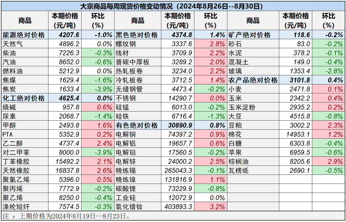 本表所示大宗商品价格(类别与产品规格说明见附表)为以人民币计价的现货价格(包含流通费用、利润和税费等)。计算这些价格时使用的信息来源,主要包括国内重点地区的生产商、贸易商及下游消费企业之间的成交、询报盘及可成交价格。价格单位为人民币元/吨。