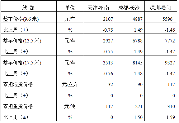 分车型看,各车型指数环比涨跌互现。其中,整车指数为1063.76点,比上周回落0.02%;零担轻货指数为1041.12点,比上周回升0.02%;零担重货指数为1063.52点,比上周回落0.01%。