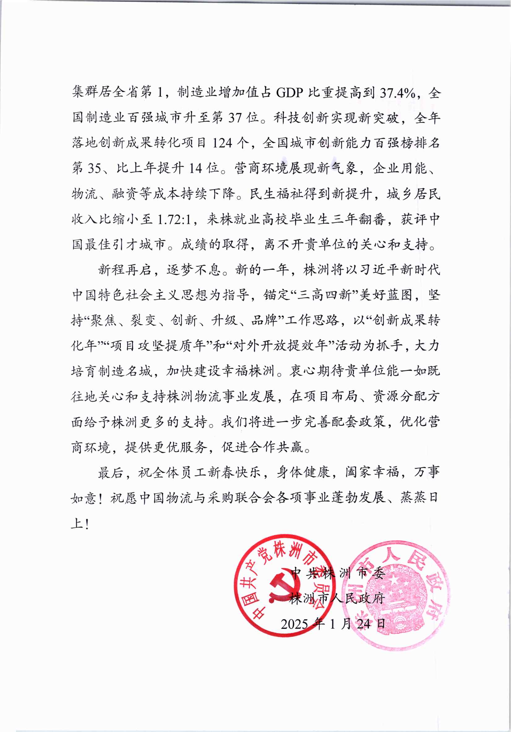 中共株洲市委、株洲市人民政府致信感谢中物联