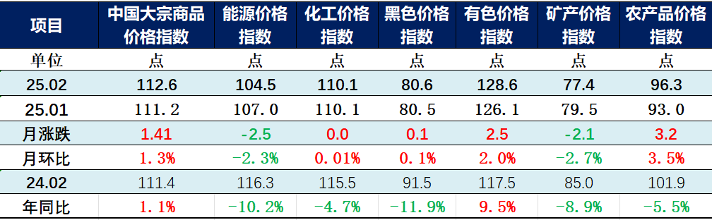 从国内外指数比较看:CBPI与上月PPI、CPI走势基本一致。1月PPI环比下跌0.2%;其中,生产资料价格环比下降0.2%,生活资料价格环比持平。1月CPI环比上涨0.7%;其中,食品价格环比上涨1.3%,非食品价格环比上涨0.6%。CBPI与CRB指数上涨、S&P GSCI指数下跌。2月,美宣布对所有进口钢铁和铝产品加征25%关税,并取消此前对加拿大、墨西哥等国的豁免政策,以及对铜启动232调查。受美关税政策影响,美国金属市场快速上扬。其中,COMEX期铜一度冲高至10432美元/吨。LME期铜亦创近三月高点,达9684.5美元/吨。