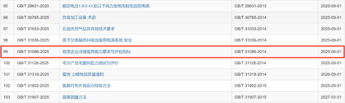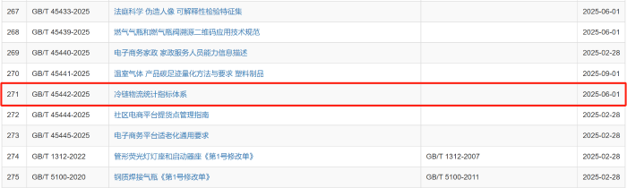 2025年2月28日,国家市场监督管理总局、国家标准化管理委员会批准发布282项国家标准,其中包括由全国物流标准化技术委员会提出并归口的《冷链物流统计指标体系》(GB/T 45442-2025)和《物流企业冷链服务能力要求与评估指标》(GB/T 31086-2025)两项国家标准。