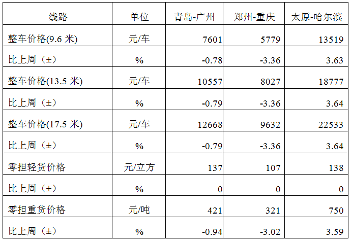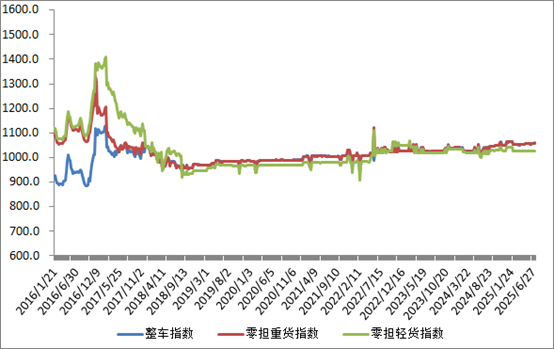分车型看,各车型指数环比小幅增长。其中,整车指数为1057.22点,比上周回升0.07%;零担轻货指数为1026.47点,比上周回升0.03%;零担重货指数为1059.37点,比上周回升0.20%。