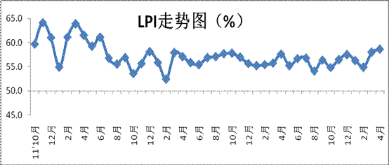 新订单指数上升,物流需求继续增加。4月份,新订单指数为60.1%,比上月回升0.3个百分点。显示出物流业需求继续向好,将保持稳中趋升的态势。从企业类型来看,综合型、运输型和仓储型物流业均保持在50%以上,分别为60.1%、60%和60.1%。