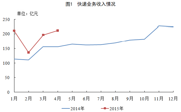 4月份,快递业务量完成15.1亿件,同比增长43.7%;业务收入完成211.9亿元,同比增长35.6%。