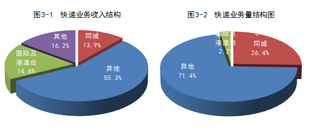1-4月,同城、异地、国际及港澳台快递业务收入分别占全部快递收入的13.9%、55.3%和14.6%;业务量分别占全部快递业务量的26.4%、71.4%和2.2%。与去年同期相比,同城快递业务收入的比重上升1.7个百分点,异地快递业务收入的比重下降0.6个百分点,国际及港澳台业务收入的比重下降了1.9个百分点。