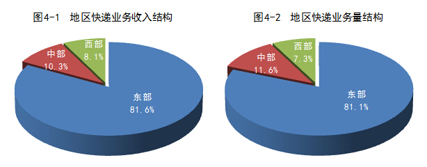 1-4月,东、中、西部地区快递业务收入的比重分别为81.6%、10.3%和8.1%,业务量比重分别为81.1%、11.6%和7.3%。与去年同期相比,东部地区快递业务收入比重下降了1个百分点,快递业务量比重持平;中部地区快递业务收入比重上升了0.7个百分点,快递业务量比重上升了0.5个百分点;西部地区快递业务收入比重上升了0.3个百分点,快递业务量比重下降了0.5个百分点。
