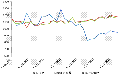 从分车型指数看,各车型指数环比均有小幅回落。整车指数为948.9点,比上周回落0.9%,比年初回落7.5%,但比5月末回升15.1%;零担轻货为1161.5点,比上周回落0.68%,比年初回升5.0%,比5月末回升4.3%;零担重货为1179.6点,比上周回落0.72%,比年初回升6.2%,比5月末回升5.4%。