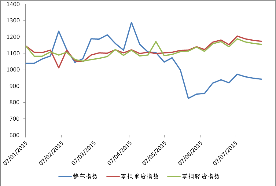 从分车型指数看,各车型指数环比均有小幅回落。整车指数为943.0点,比上周回落0.62%,比年初回落8.1%,但比5月末回升14.4%;零担轻货为1154.8点,比上周回落0.58%,比年初回升4.4%,比5月末回升3.7%;零担重货为1173.5点,比上周回落0.52%,比年初回升5.7%,比5月末回升4.8%。