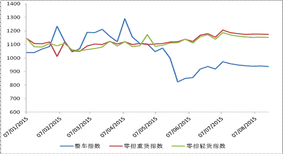 从分车型指数看,整车、零担指数环比均有所回落。整车指数为937.2点,比上周回落0.49%,比年初回落8.6%;零担轻货指数为1151.6点,比上周回落0.2%,比年初回升4.1%;零担重货指数为1173.6点,比上周回落0.29%,比年初回升5.7%。