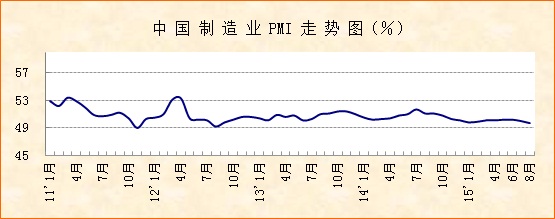 、国家统计局服务业调查中心发布的2015年8月份中国制造业采购经理指数(PMI)为49.7%,较上月下降0.3个百分点。数据回落有淡季因素影响,在预期范围之内,经济平稳向好的基本面没有改变。当前政府一系列定向调控措施效应正在不断显现,经济结构持续向好,高新技术产业加快发展,新的增长动力加快孕育成长,价格低位回稳,企业预期仍然看好,经济运行保持在适度合理区间。PMI指数小幅回调,也反映出当前经济下行压力仍然较大,稳增长仍需继续发力。