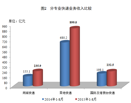 1-8月,同城、异地、国际及港澳台快递业务收入分别占全部快递收入的14.4%、54.9%和14.2%;业务量分别占全部快递业务量的26.6%、71.3%和2.1%。与去年同期相比,同城快递业务收入的比重上升1.8个百分点,异地快递业务收入的比重下降0.4个百分点,国际及港澳台业务收入的比重下降了1.9个百分点。