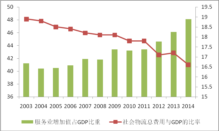 图 2003-2014年产业结构变化与物流成本的走势变化 单位:%