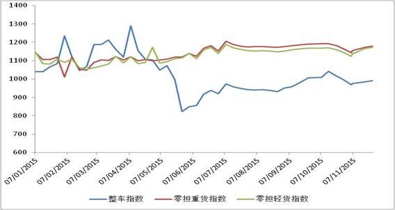 各车型指数环比均有所回升,回升幅度有所减少,其中整车指数环比涨幅整体高于零担指数,零担指数中轻货指数涨幅略高于重货指数。本周,整车指数为990.8点,比上周回升0.6%,比年初回落3.4%;零担轻货指数为1171.5点,比上周回升0.6%,比年初回升5.9%;零担重货指数为1177.7点,比上周回升0.5%,比年初回升6.0%。
