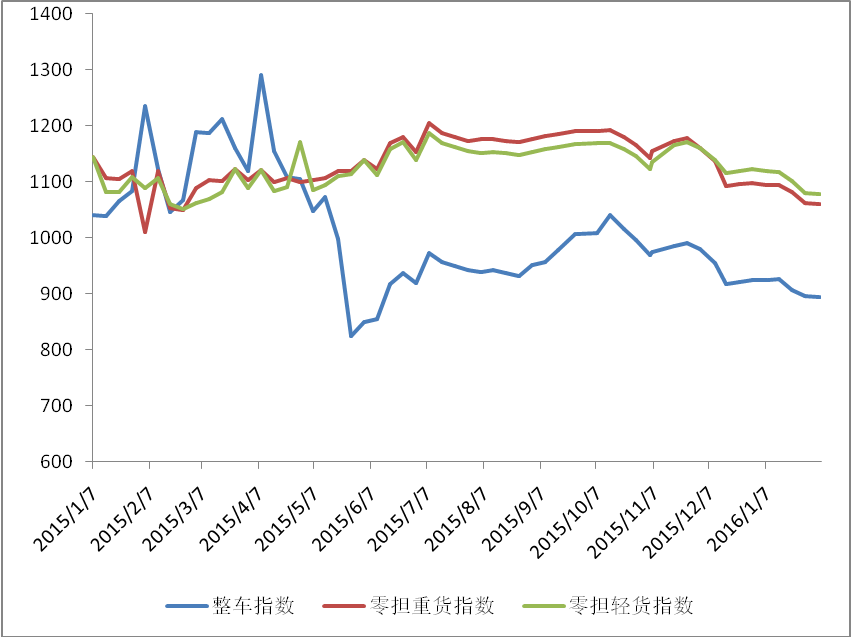 各车型指数环比均有所回落,其中整车指数回落幅度略高于零担指数。本周,整车指数为894.9点,比上周回落0.22%,比年初回落3.3%,同比回落27.5%,降幅有所扩大;零担轻货指数为1077.7点,比上周回落0.21%,比年初回落4.0%;零担重货指数为1060.2点,比上周回落0.21%,比年初回落3.5%。