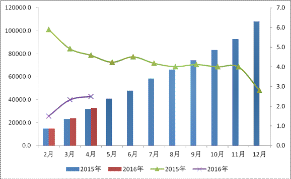 从结构看,一方面,采矿业、高耗能行业物流需求增速回落幅度较大,特别是重点化解过剩产能的钢铁、煤炭行业均出现负增长。4月份,采矿业同比增长0.1%,增速较3月份回落3个百分点。高耗能行业增长6.3%,回落0.9个百分点;另一方面,高技术制造业、支撑工业转型升级的高端细分行业保持较快增长。4月份,高技术产业增长9.7%,增速较3月份加快0.1个百分点。其中,医药制造业增长10.7%,计算机、通信和其他电子设备制造业增长8.3%,雷达及配套设备制造行业增加值增长118.4%,航空、航天器及设备制造增长28.6%,城市轨道交通设备制造增长25.3%,通信设备制造增长13.7%,增速均高于全部规上工业。