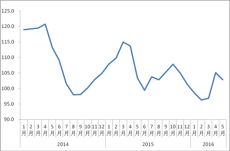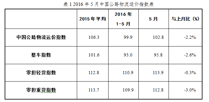 和林安物流集团联合调查的中国公路物流运价指数2016年5月为102.8点,比上月回落2.2%,比上年同期下降0.6%。