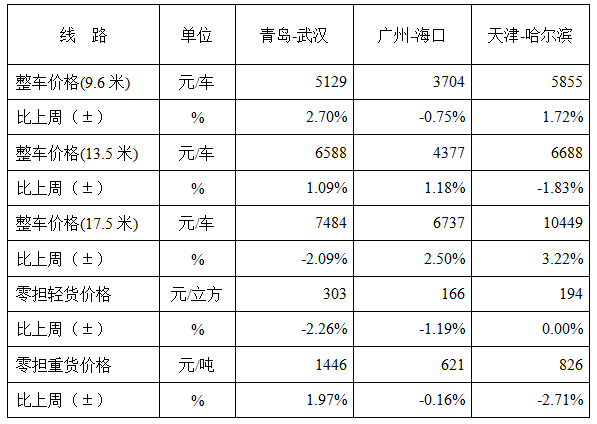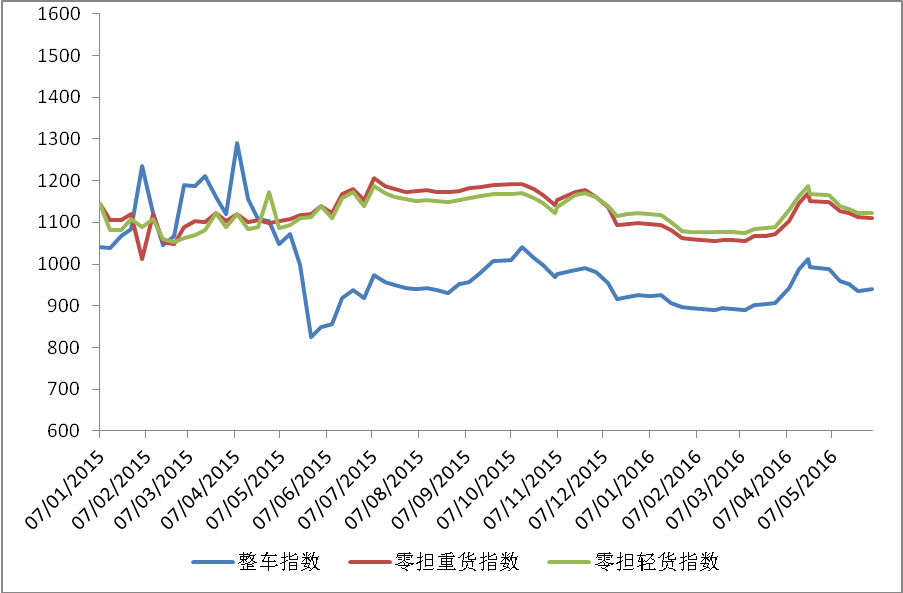 各车型指数比上周涨跌不一,其中整车指数环比回升,零担指数环比回落,零担轻货指数回落幅度高于零担重货指数。本周,整车指数为940.7点,环比回升0.5%,比上年同期回升10.7%,比年初回升1.6%;零担重货指数为1111.6点,环比回落0.06%,同比回落2.5%;零担轻货指数为1122.1点,环比回落0.09%,同比回落1.4%。