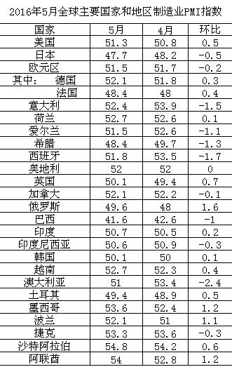 2016年5月全球主要国家和地区制造业PMI指数
