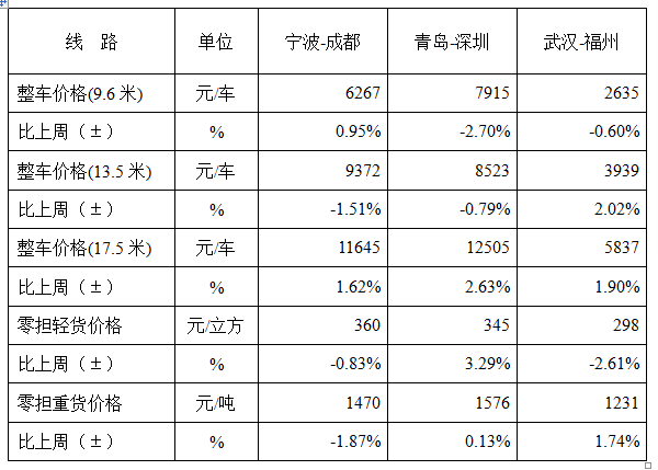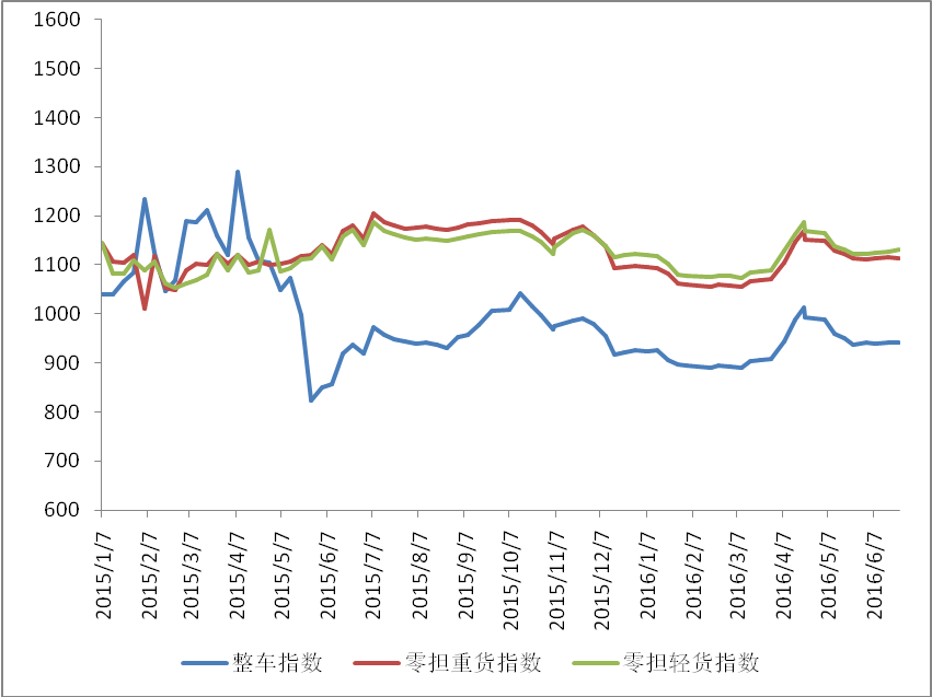 各车型指数涨跌不一,其中整车、零担轻货指数环比回升,零担重货指数则有所回落。本周,整车指数为941.1点,环比回升0.07%,比上年同期回升0.3%,比年初回升1.7%;零担重货指数为1114.1点,环比回落0.17%,同比回落5.6%;零担轻货指数为1131.2点,环比回升0.3%,但同比回落3.5%。