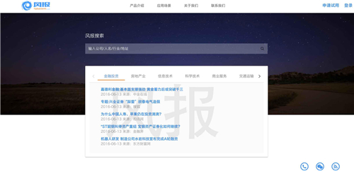 “风报”(www.riskstorm.com)是一套使用自然语言处理技术,分析处理海量政府公开数据及媒体信息,为企业提供风险控制及情报分析的人工智能情报分析系统。继2015年9月首轮发布后,开始广泛服务于各行业,尤其在金融领域获得认可,帮助企业提升精细化管理水平,为企业建立风险防范及情报获取体系。