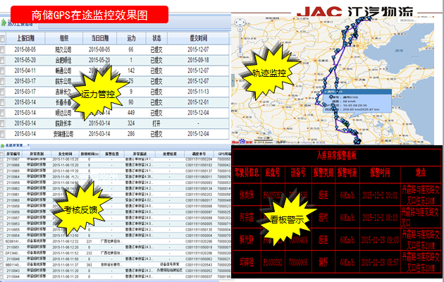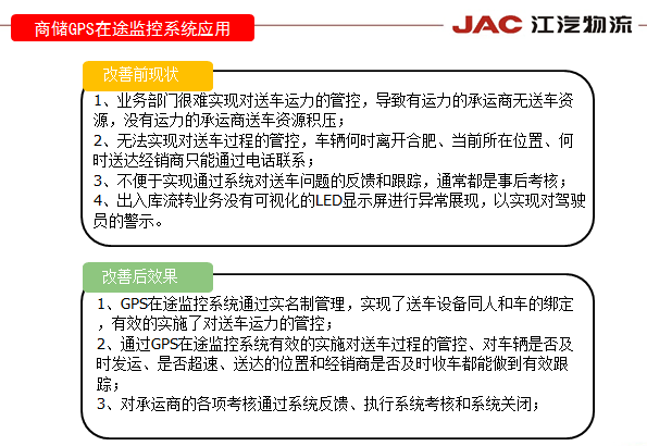 安徽江汽物流有限公司商用车GPS在途监控于2014年8月开始建设,2015年2月出入库流转模块GPS在途监控正式上线,2015年4月长途发运模块GPS在途监控正式上线,实现了信息化手段和管理机制对运输过程的全面监控,本项目以商储公司服务体系为契机,明确“敬客经营、服务主业”的经营意识,树立高准时率、低质损率的服务理念,以经销商权益保障方案为支撑,以GPS在途监控系统为主要抓手,通过系统对送车时效和送车质量考核,考核金额直接通过系统关联至财务核算系统予以兑现。