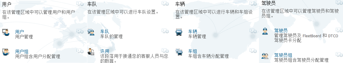 FleetBoard®系统可以通过建立“子车队”或“驾驶员组”的方式,为有分公司或多条线路的客户实现分层、分组管理,提高对车辆和驾驶员的管理效率。FleetBoard®在帐户权限上也可以设置分层,车队长或驾驶员组组长可以查看车队或驾驶员组的信息,而企业高层管理人员或企业主则拥有最高权限,可以看到所有车队、车辆及驾驶员信息。